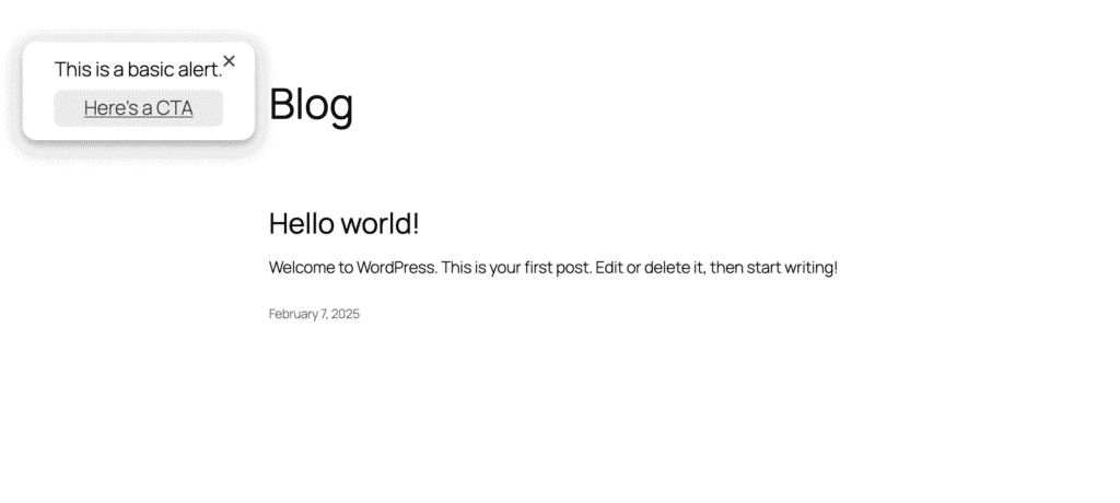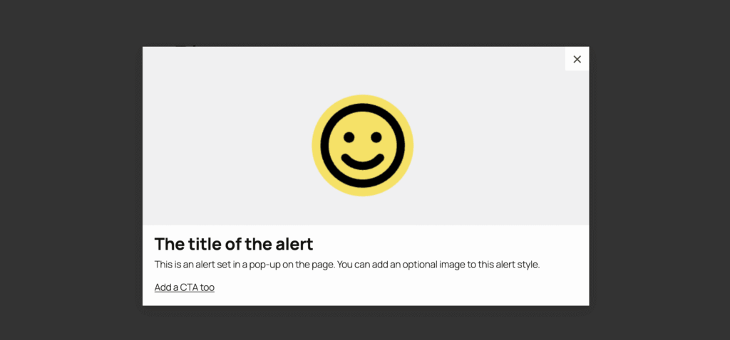This alert appears as a modal pop-up overlaying your page. You can add an image if you’d like.